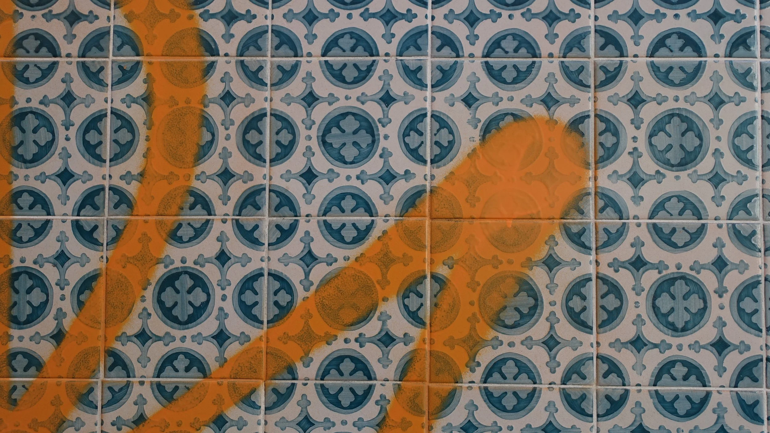 Orange spray paint on azulejos, Portuguese ceramic tiles in Lisbon, Portugal (2017)